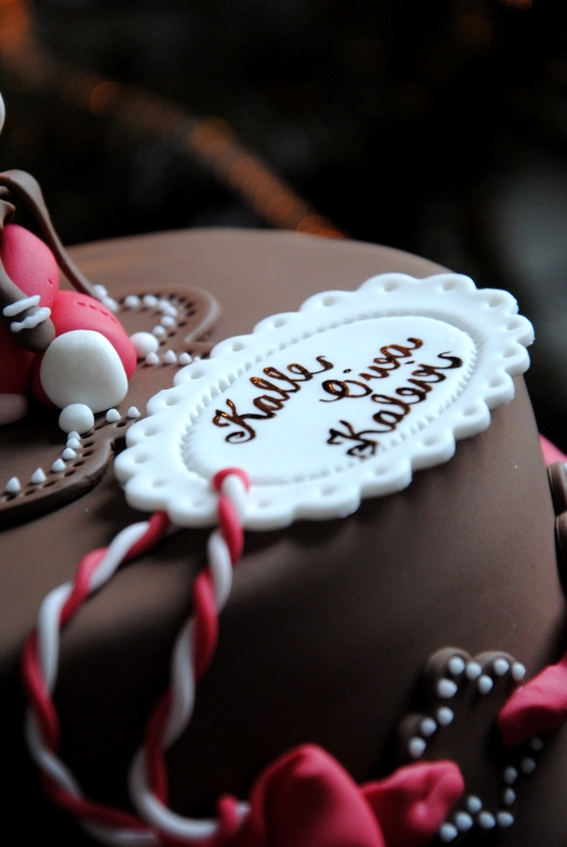 In English: This small Christmassy cake went to a little boy's 6 month party :) It is a moist chocolate cake filled with homemade orange curd and orange mousse. The cake is covered with SMBC and Satin Ice. I also used Satin Ice for the decorations.